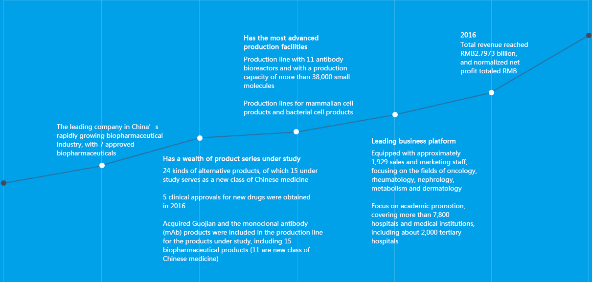 • Through calculation by revenue, it always ranks first in the recombinant human erythropoietin (rhEPO) market in China since 2002; combined market share with SEPO reaching 43.9%2 (together with SEPO) in 2016