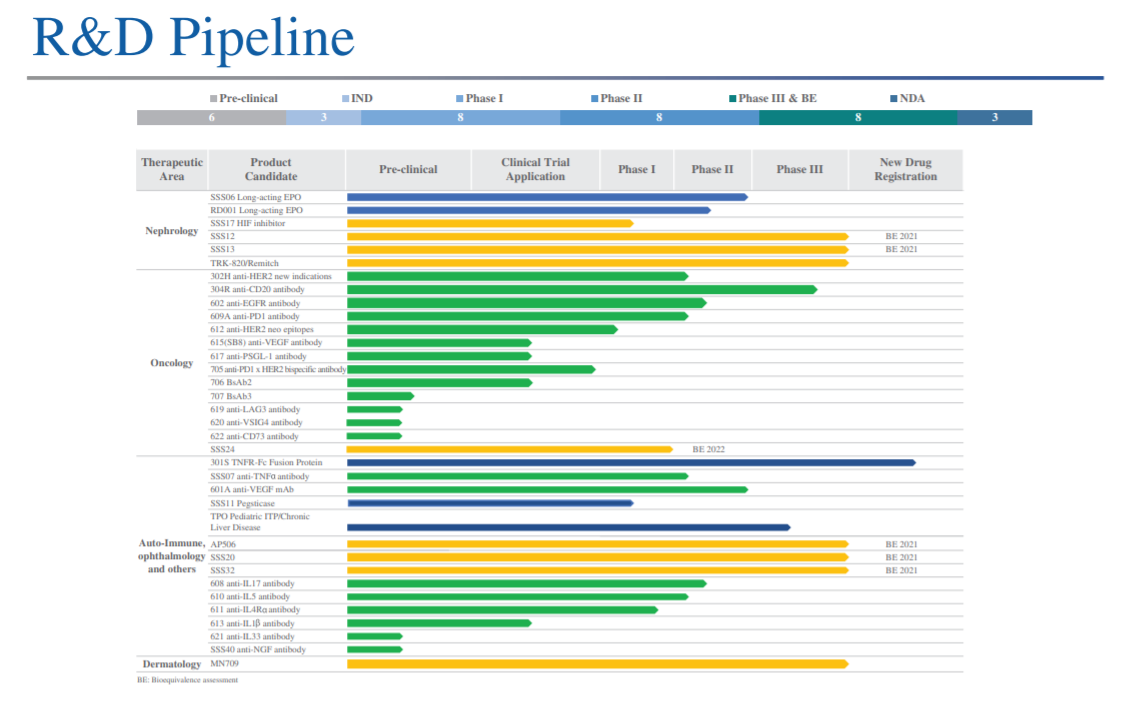 In terms of R&D, 3SBio has been accelerating its pipeline via in-house projects and external partnerships. In the first half of 2021, 3SBio had a total of 35 product candidates under its pipeline, of which 24 were developed as innovative drugs in China. The candidates included 21 monoclonal antibodies or bispecific antibodies, 5 other biological products, and 9 small molecule drugs. There are 14 candidates in oncology, 14 in autoimmune and other diseases, 6 in nephrology, and 1 in dermatology.